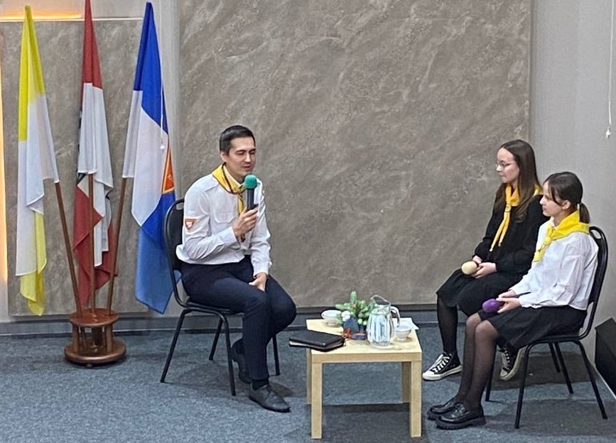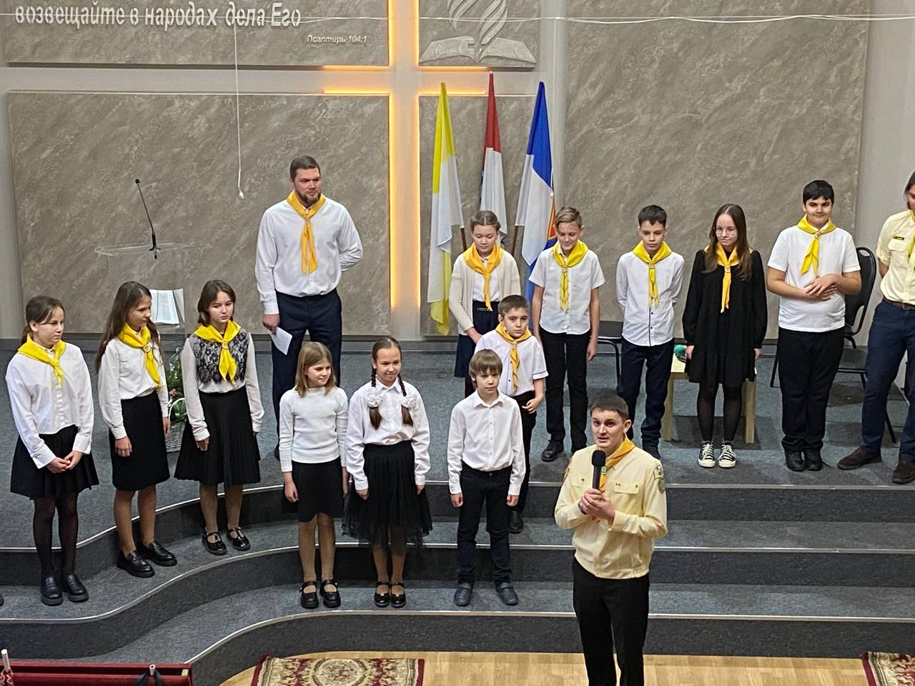 Ребята строем вышли на сцену, где новый руководитель молодёжного отдела Кавказской союзной миссии Антон Бойков и руководитель следопытов Ростовско-Калмыцкого объединения Алексей Рыжов торжественно повязали галстуки троим новичкам.