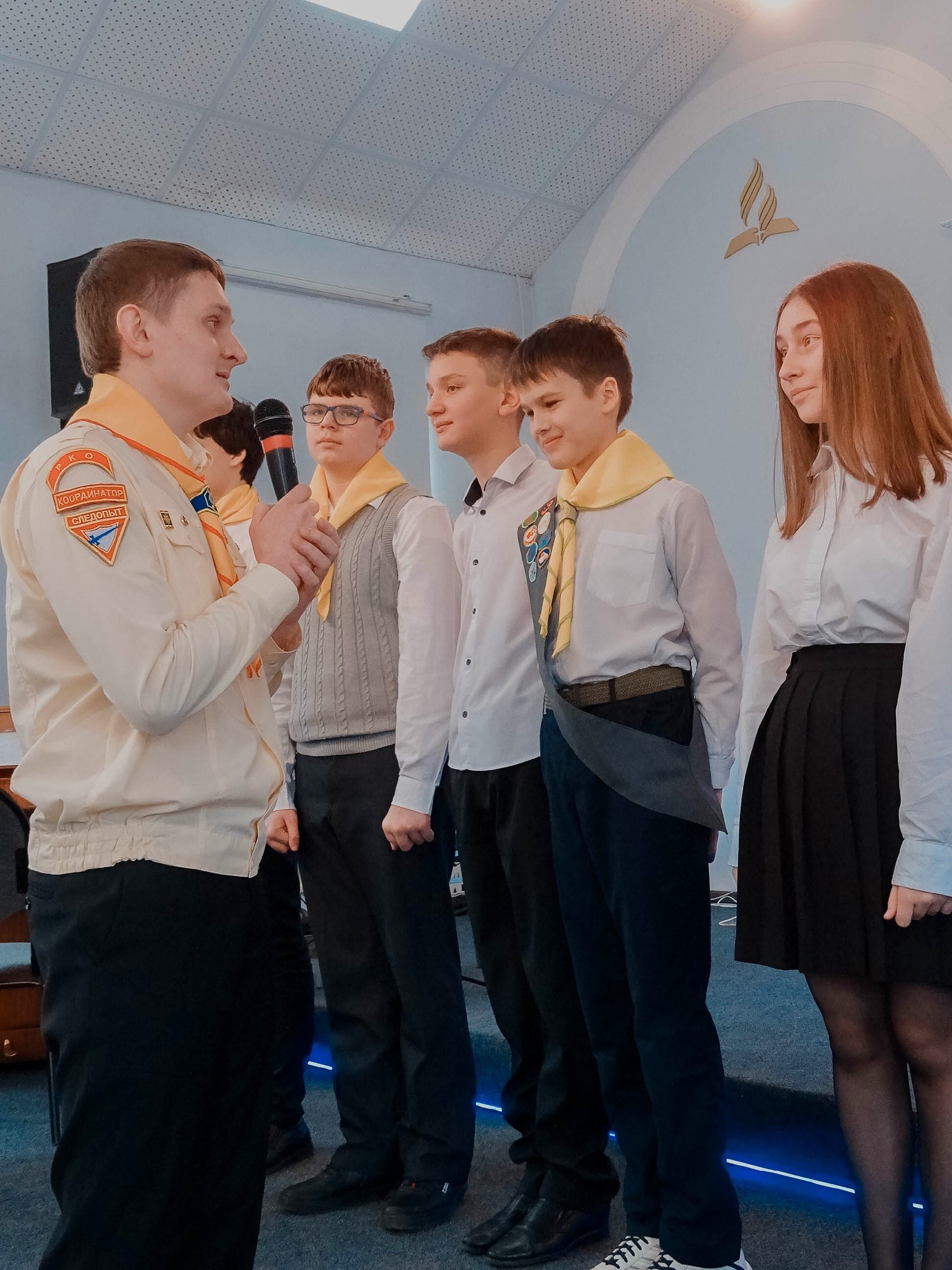 Под торжественный марш, стройным шагом, бережно держа в руках флаги Искателей Приключений и Следопытов, на сцену поднялась группа подростков, каждый из которых, согласовав со своими родителями, принял для себя решение посвятить себя Господу. Ведущие задали им вопросы относительно их возраста, чем они любят заниматься и основной вопрос о том, почему они решили стать следопытами. Под звуки гимна ребятам повязали желтые галстуки.