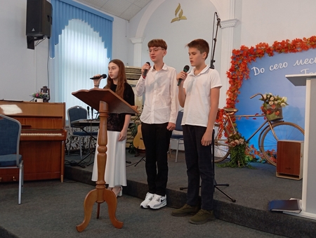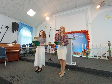 Слова благодарности Михаилу и Лидии Олийник от всей общины в стихотворной форме на сцене выразили члены совета. А затем, всей семьей Олийник в составе семи человек было исполнено прекрасное пение «Богу провести тебя несложно».